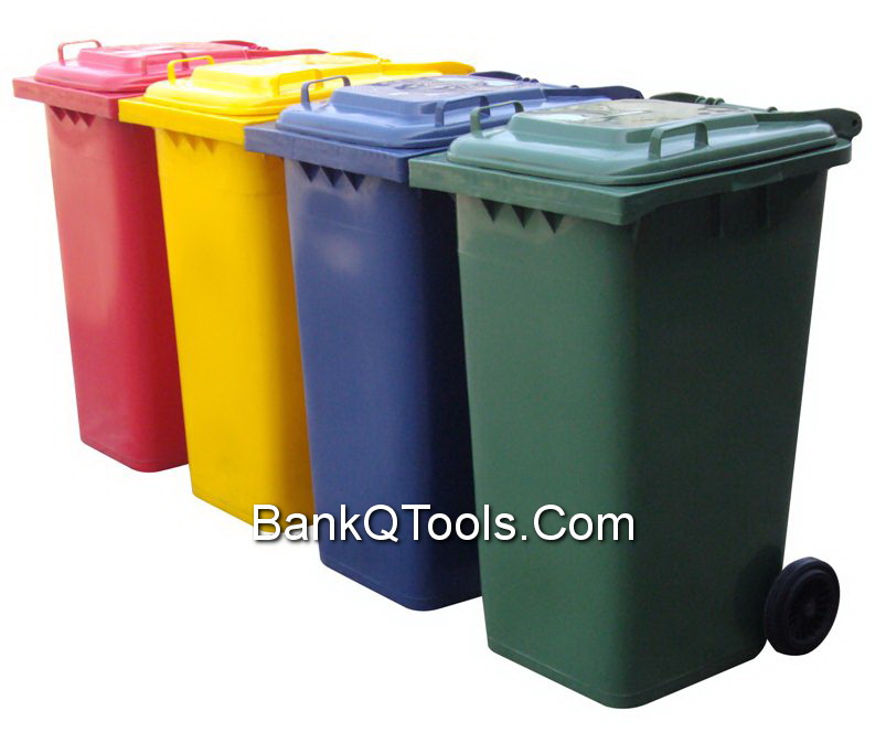 • ถังขยะทรงสี่เหลี่ยมแบบมีล้อ ขนาด 120 และ 240 ลิตร สีแดง เขียว เหลือง และ น้ำเงิน แยกขยะได้ตามสี